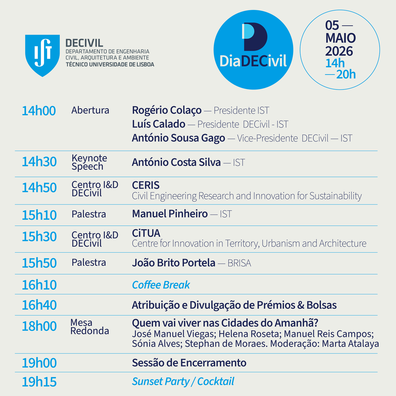 No dia 5 de Maio de 2026, o Departamento de Engenharia Civil, Arquitetura e Ambiente do Instituto Superior Técnico celebra 45 anos com o Dia DECivil 2026, no TIC – Técnico Innovation Center.